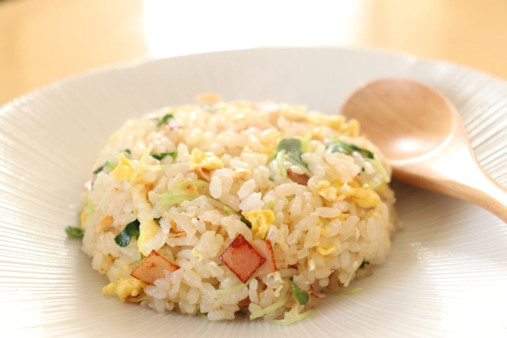 - フライパンに油と卵、ご飯を入れ、つぶすように炒める。
