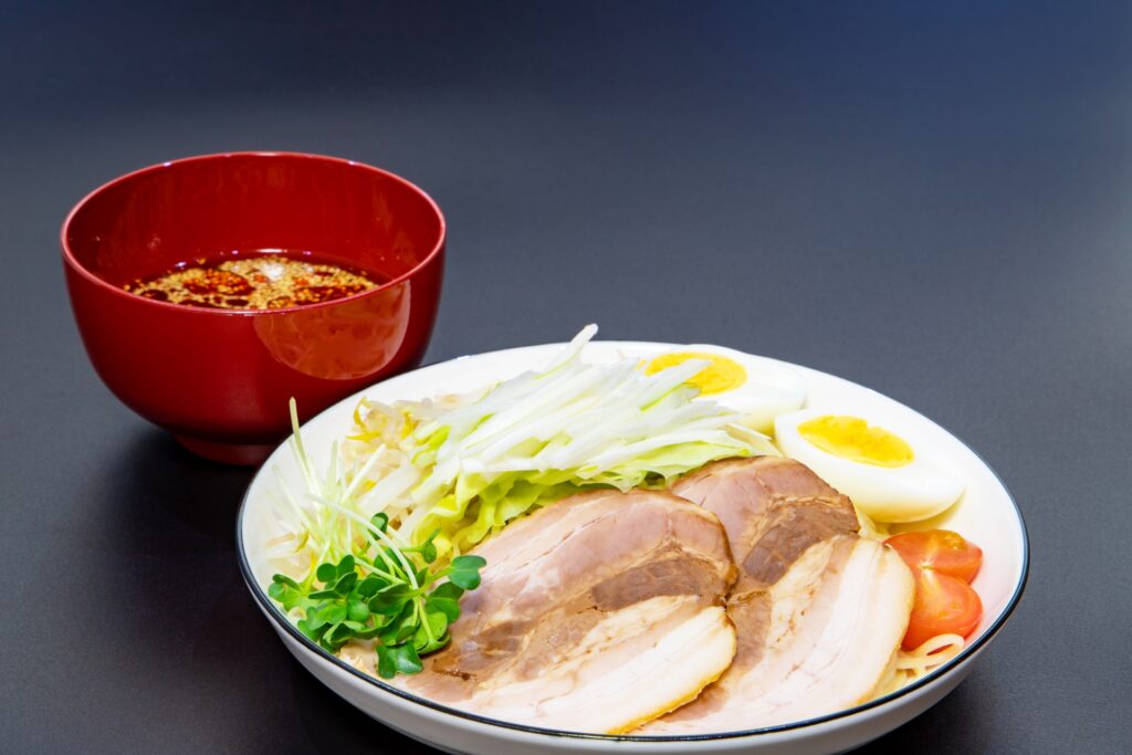- 麺を氷水で締め、水気を切って盛り付ける。