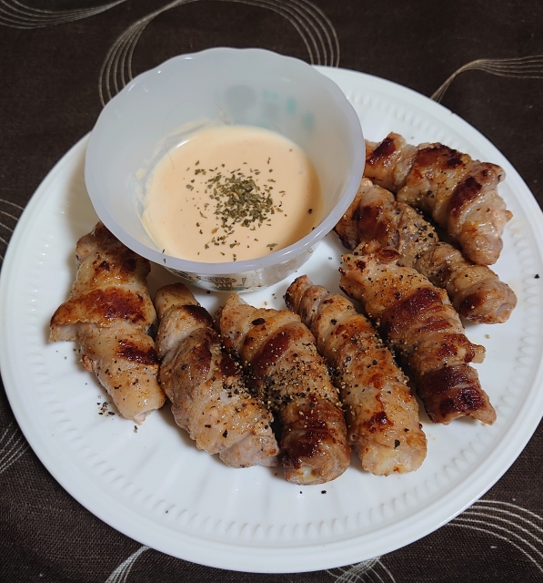 - 塩こしょうを豚バラ肉の脂に負けないくらいしっかりと振る。