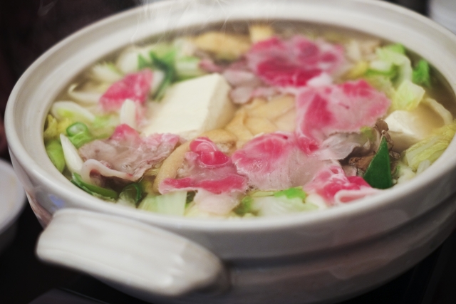 - ①の白菜の軸、②のしいたけと水菜を加え、火が通るまで煮る。