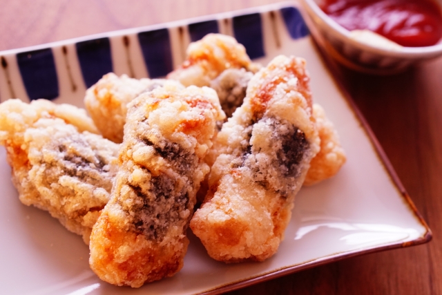 きつね色になったら油を切って取り出す。 - 粉山椒を振り、切ったかぼすを添えて完成。