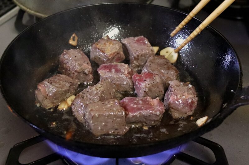 - にんにくをサラダ油で炒めて取り出し、①の肉を中火で両面焼き付け、ふたをし、弱火にして5分ほど蒸し焼きにする。