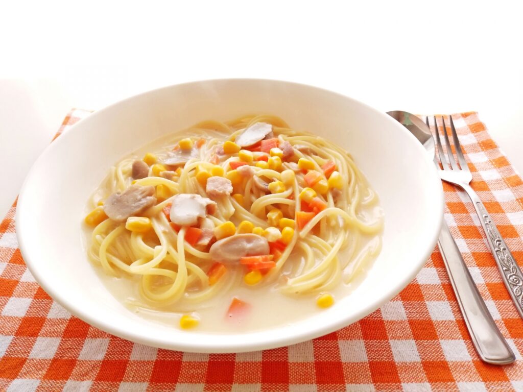 kcal家事ヤロウのコーンクリームパスタのレシピです。