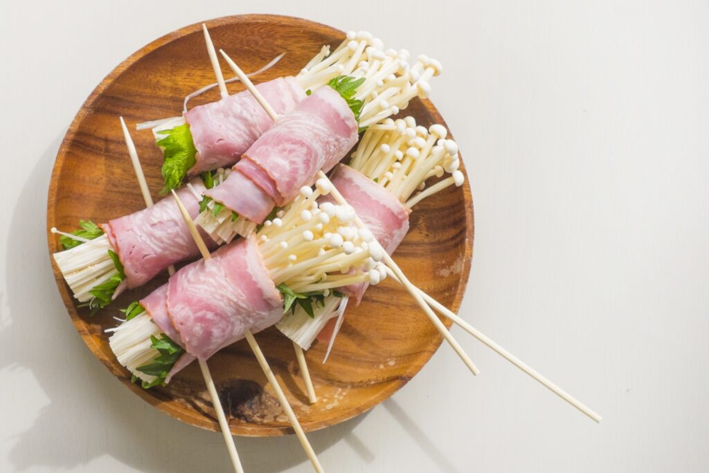 - ピーマンも半分に切ってベーコンで巻いて串を刺す。
