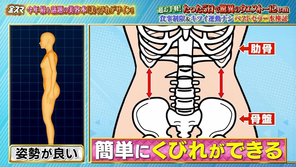 1日30分に満たないエクササイズで、肋骨と骨盤を正しい位置に調整していくことで、くびれを作っていきます。今回の金スマでは、5日間で12㎝のウエストダウンを達成しました。