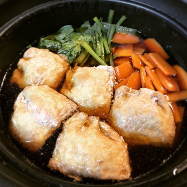 水溶き片栗粉を回し入れてとろみをつけ、ごま油少々で香りつけて火を止める。 - なすを器に盛り、③の豆腐あんをかけて完成。