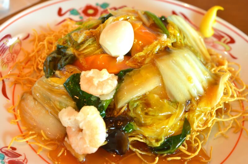 煮立ったら弱火にし、混ぜ合わせた【B】を加えてとろみをつける。 - 器に③の麺を盛り、⑤のあんをかけて完成。